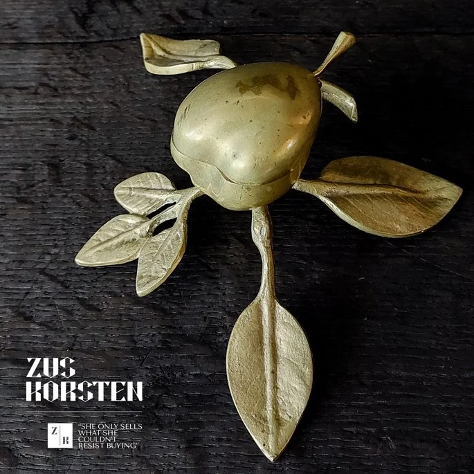 Antique hinged bronze patinated apples and a pear trinket boxes on a twig with leaves, to keep or collect your little trinkets in.
