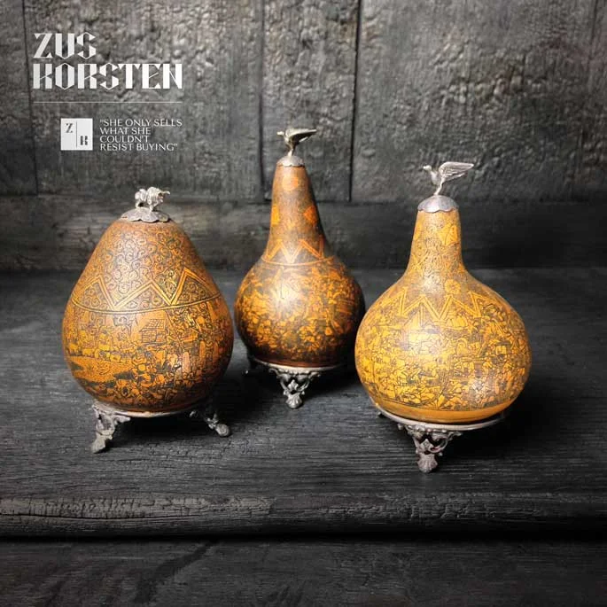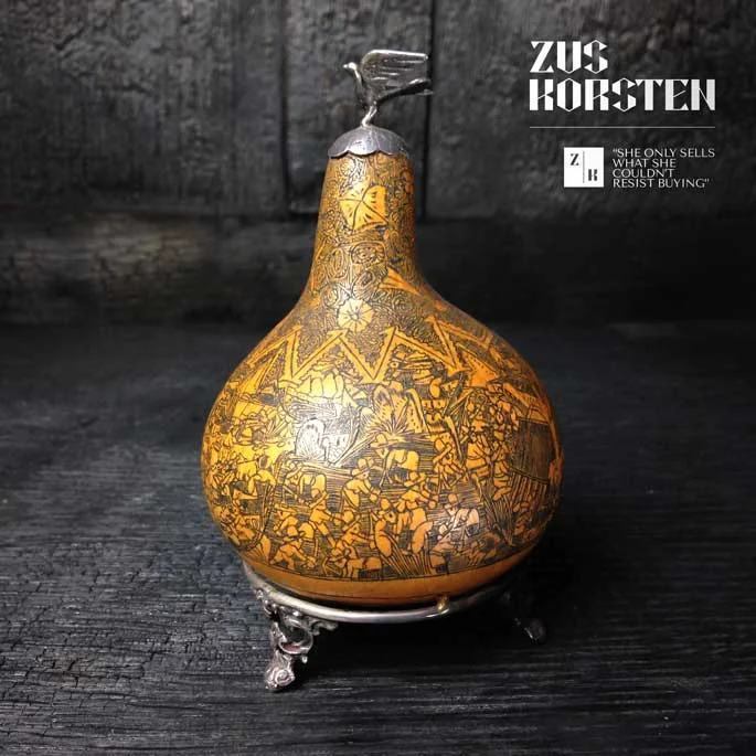 I came across these carved gourds on my trip to Argentina visiting my old dutch Friend who was exhibiting in Buenos Aires. I was on my way to the vernissage when I passed a very small antique shop. These gourds were sitting in the back of the little shop hidden in an even smaller cabinet.