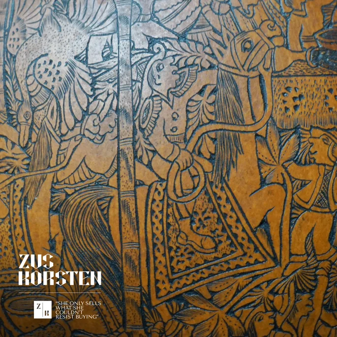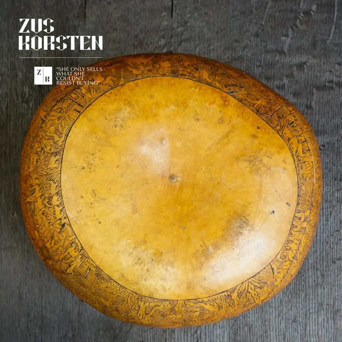 The large hand-carved Calabash, or gourd, depicts the story of early village and farm life; villagers and animals, the farming of crops as well as a parade with music and a bullfight.