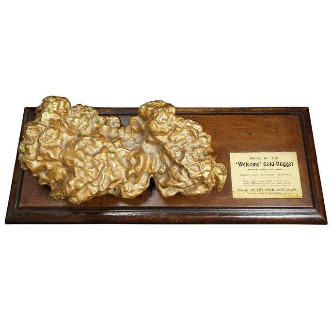 This is rare. It’s the only thing left of the biggest gold nugget ever found. The Welcome Nugget, found in Victoria Australia in 1858. But of course it didn’t last long. Because of its elephantine value it was melded down into gold coins by the London Mint within two years. Just before they did, a few models of the nugget were made. Most of these models are in museums now. This one used to be in the possession of a famous London mineral and fossil trader. Now it can be yours. (Today the ‘Welcome’ nugget is still the second largest nugget ever found.)