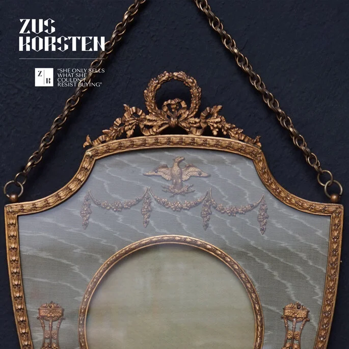 The heraldic shield form frame has a beautiful shape. Behind the glass, the frame is lined with a wonderful green taffeta and then mounted with some small pretty ormolu mounts in the form of flower garlands and an eagle holding arrows, the back opens in its original way. It hangs by a very pretty double chain.