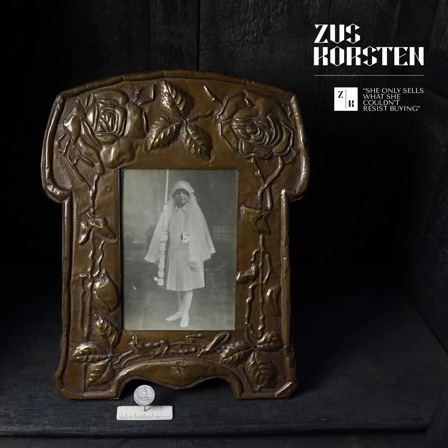 This lovely latten picture frame with floral decoration was very modern for its time. It was inspired by the Arts and Crafts tradition and therefore made without machines or molds. True craftsmanship. Made from a brass plate and hammered and shaped by hand resulting in this great piece. A great find.